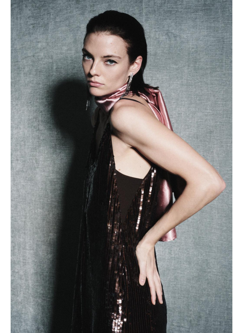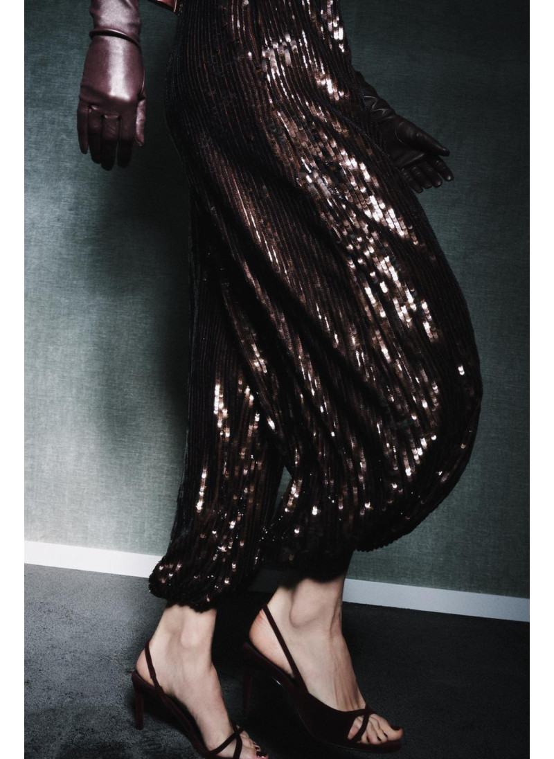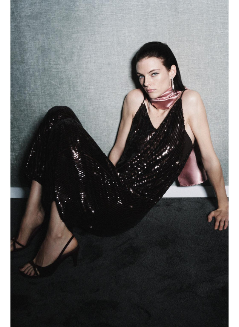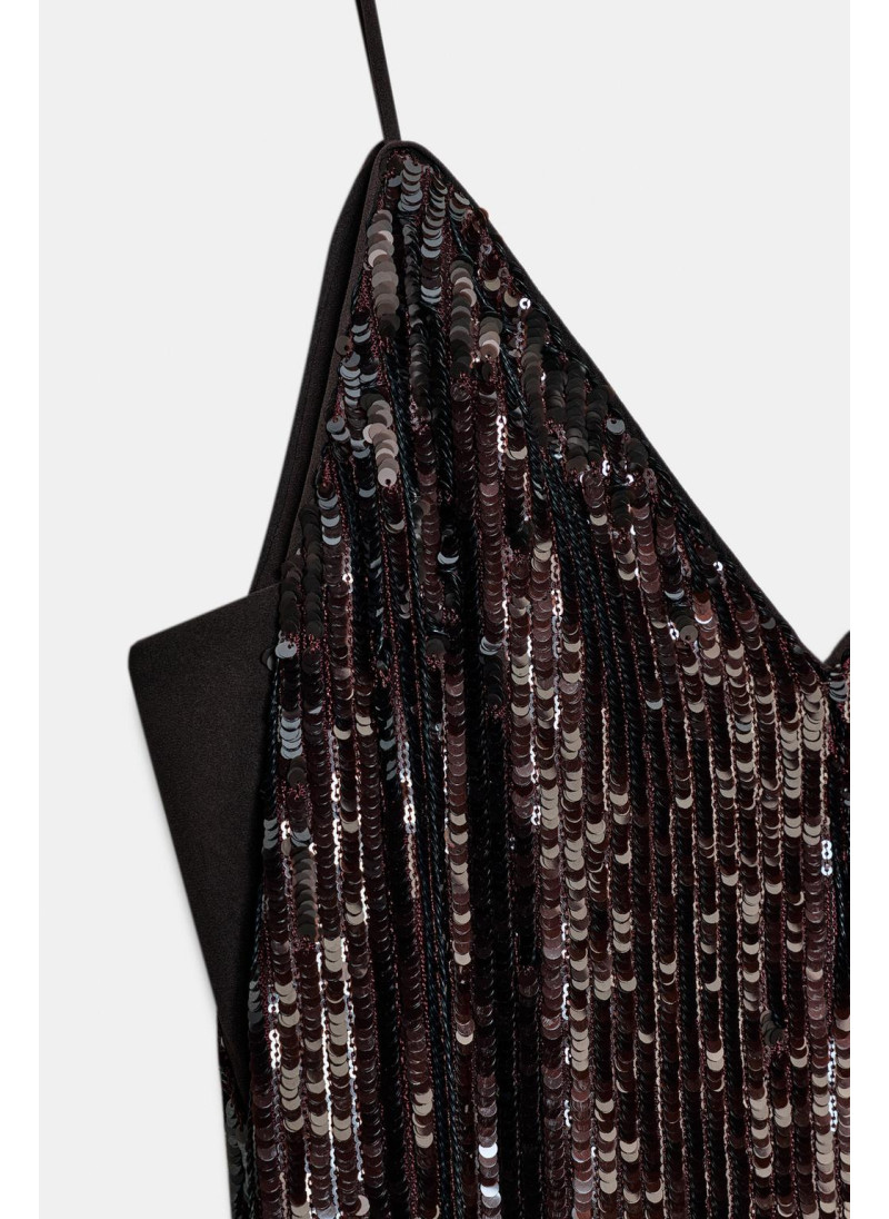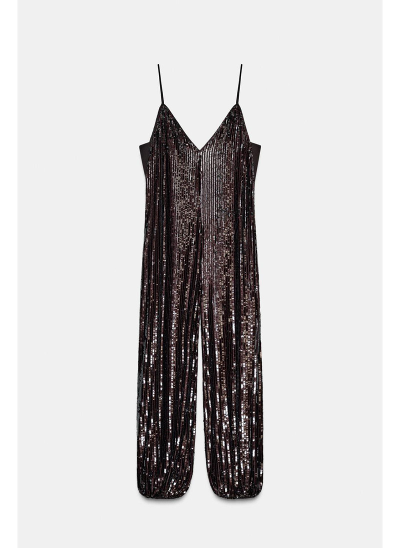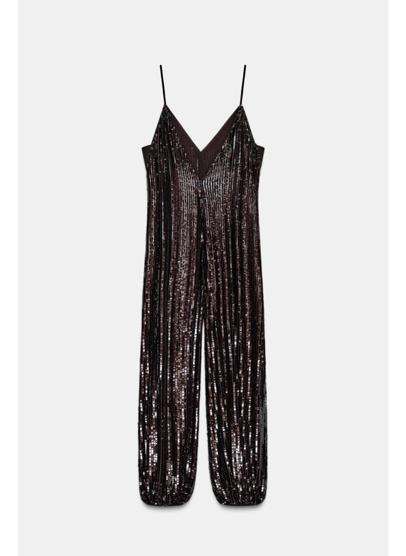 Длинный комбинезон с v-образным вырезом и тонкими бретелями. Деталь с пайетками. Собранный эластичный подол с эластичной отделкой.