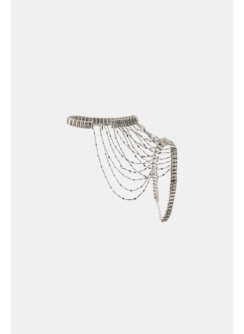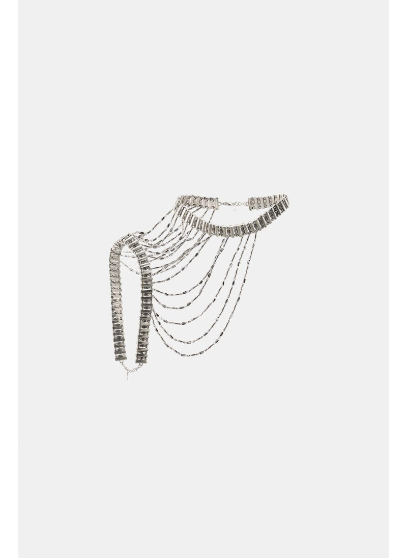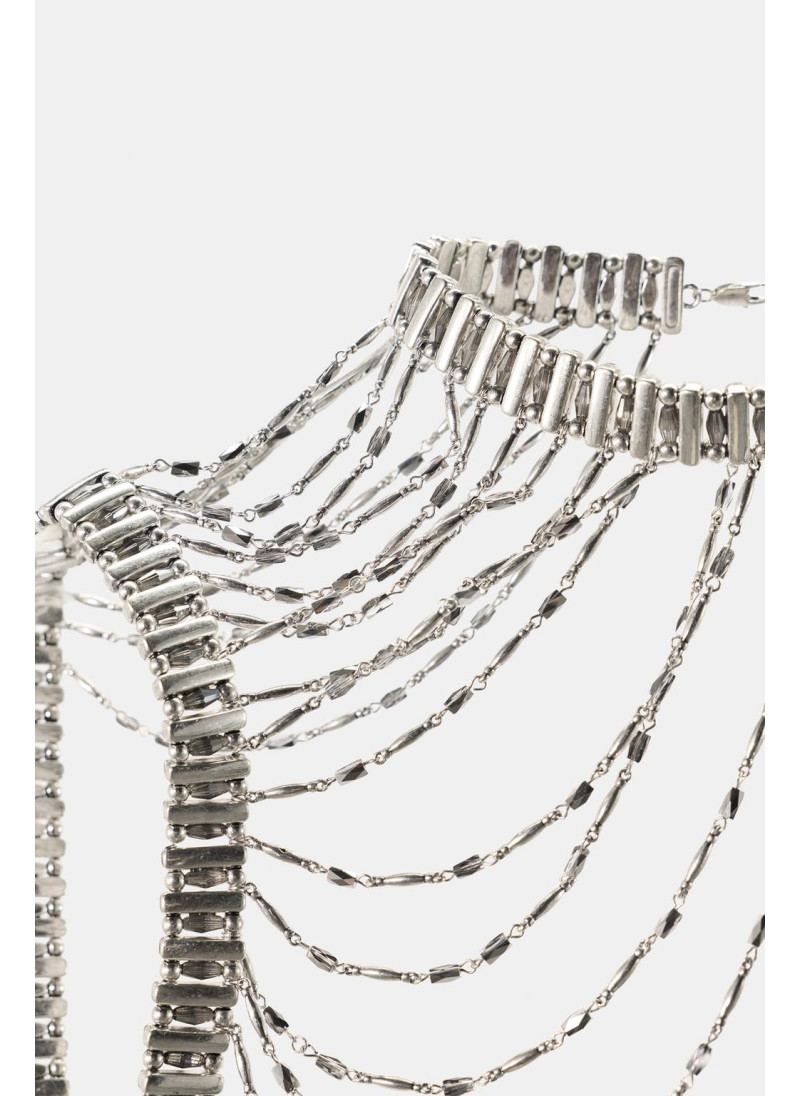 Ожерелье на плечо из множества металлических деталей с бусинами. Застежка-карабин на шее и плече.