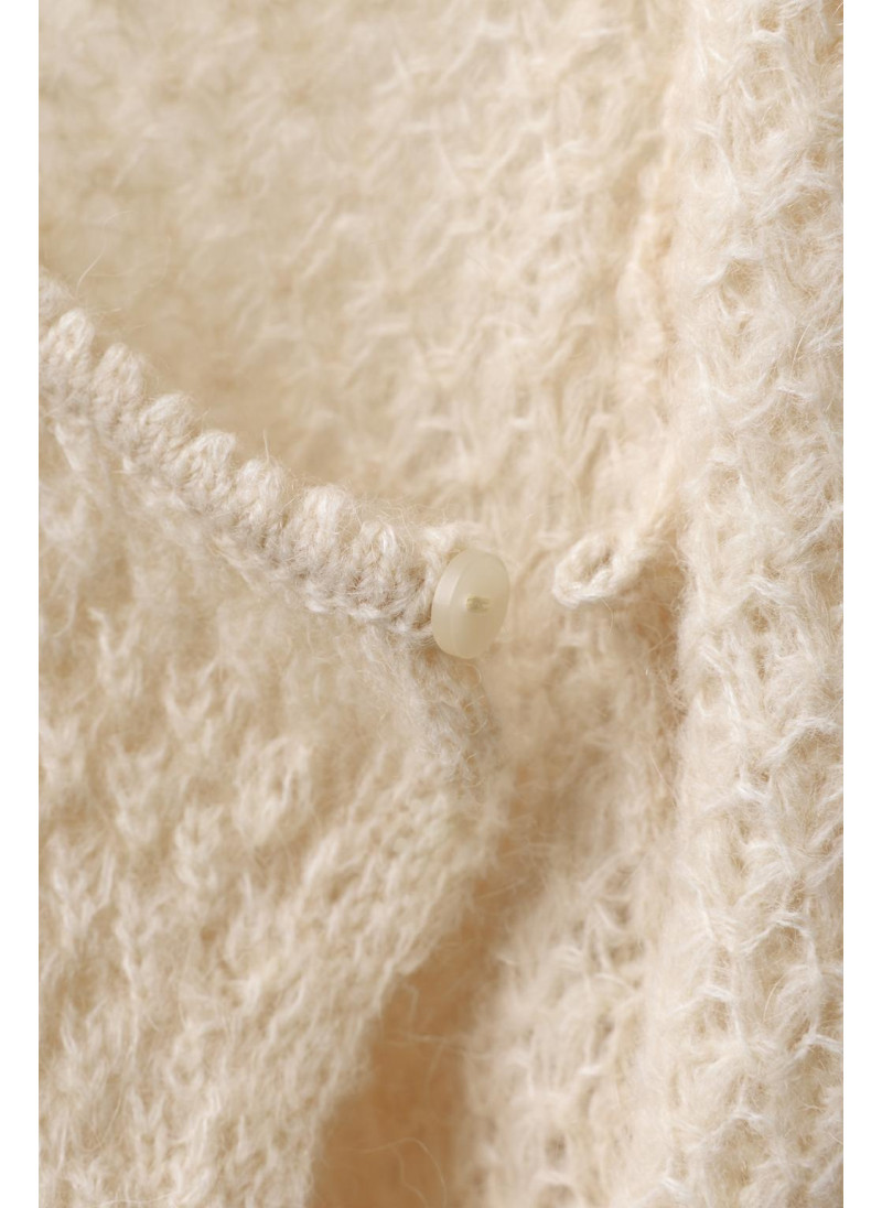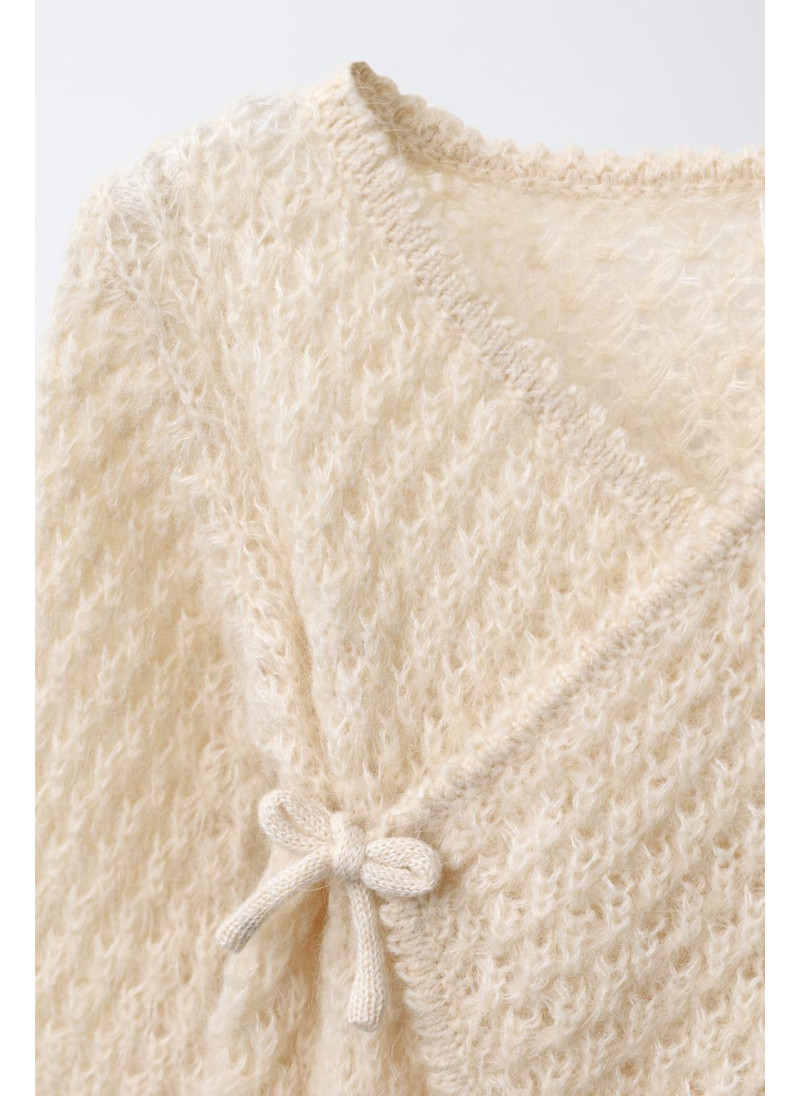 Трикотажное боди с V-образным вырезом и длинными рукавами. Застежка на запах со скрытой пуговицей в форме капли и бантом спереди. Изготовлено из ткани с 15% содержанием шерсти.