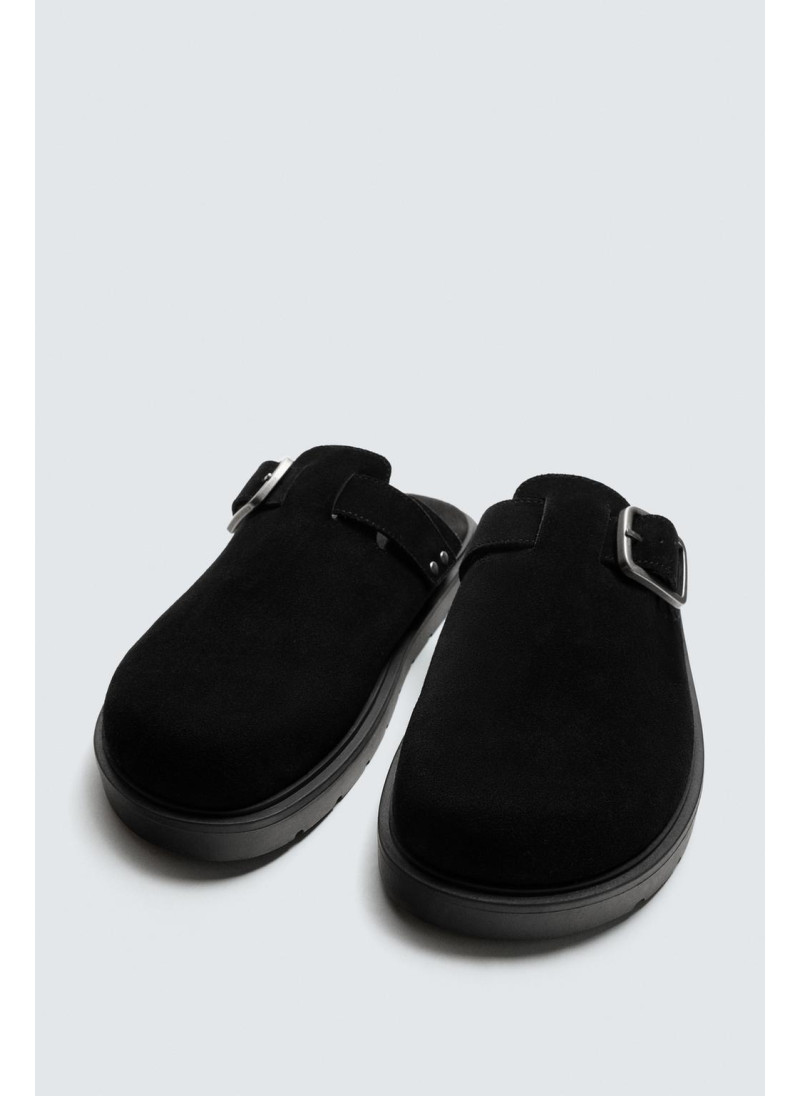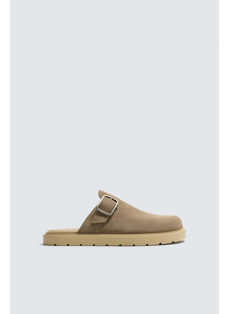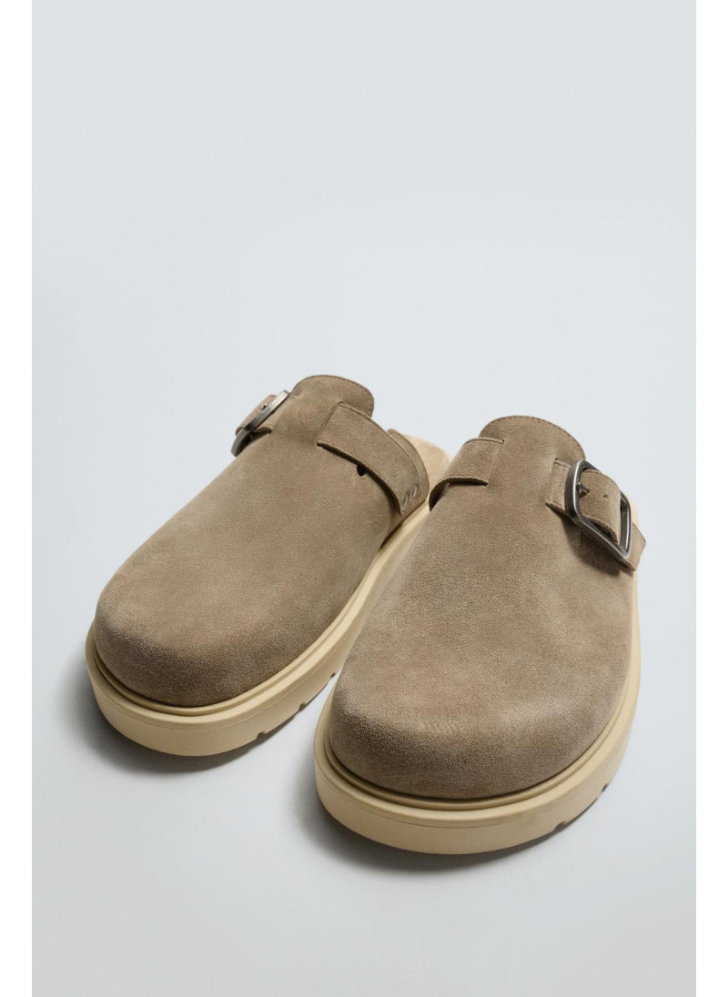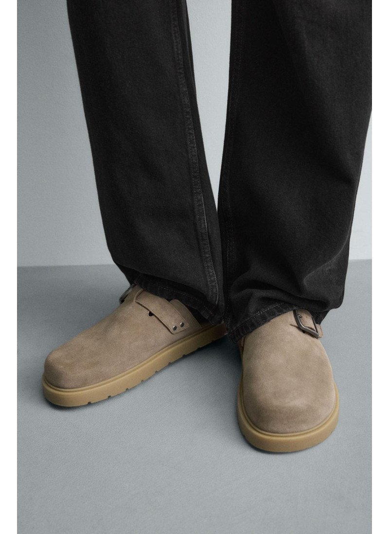 Клоги изготовлены из кожи с замшевой отделкой. Металлическая деталь-пряжка на мыске. Круглый носок. Массивная подошва контрастного цвета.
