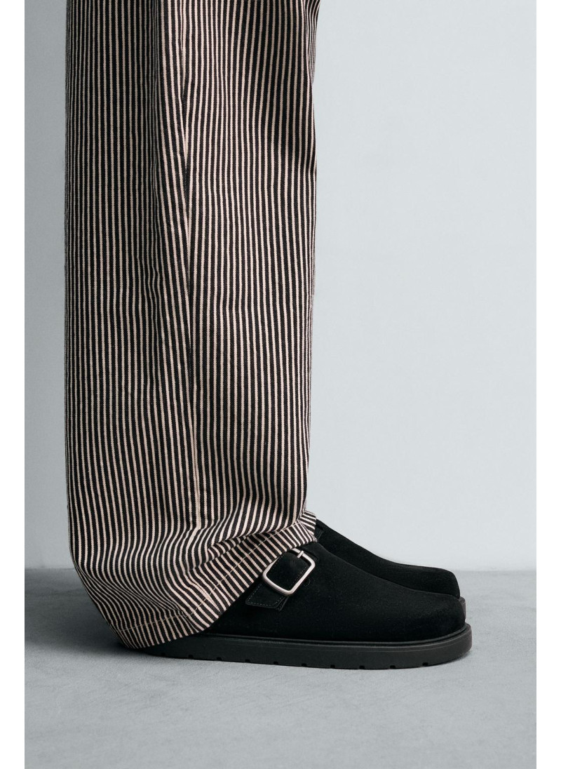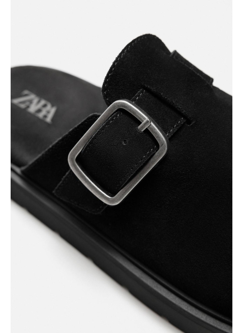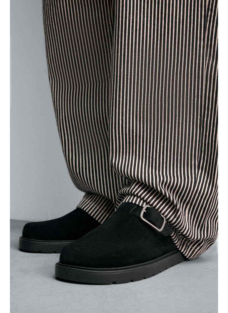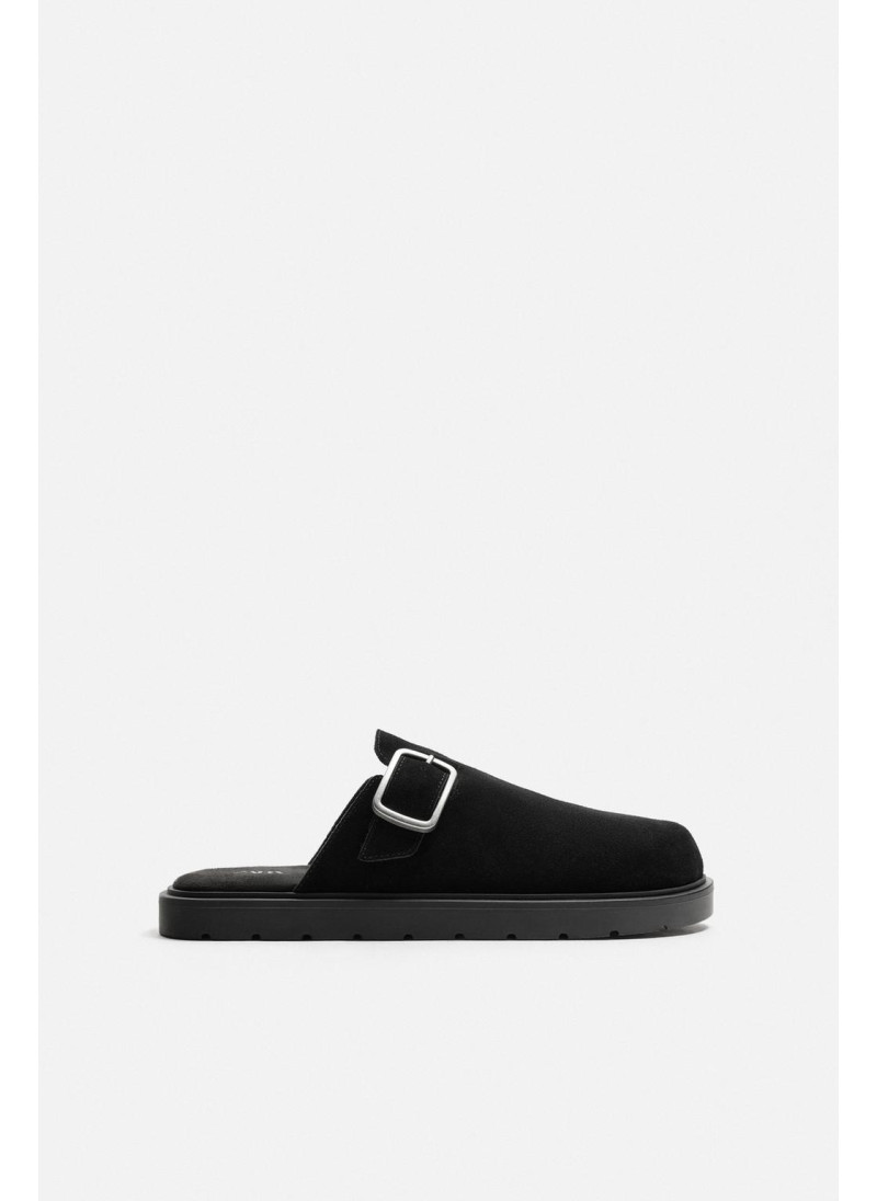 Клоги изготовлены из кожи с замшевой отделкой. Металлическая деталь-пряжка на мыске. Круглый носок. Массивная подошва контрастного цвета.