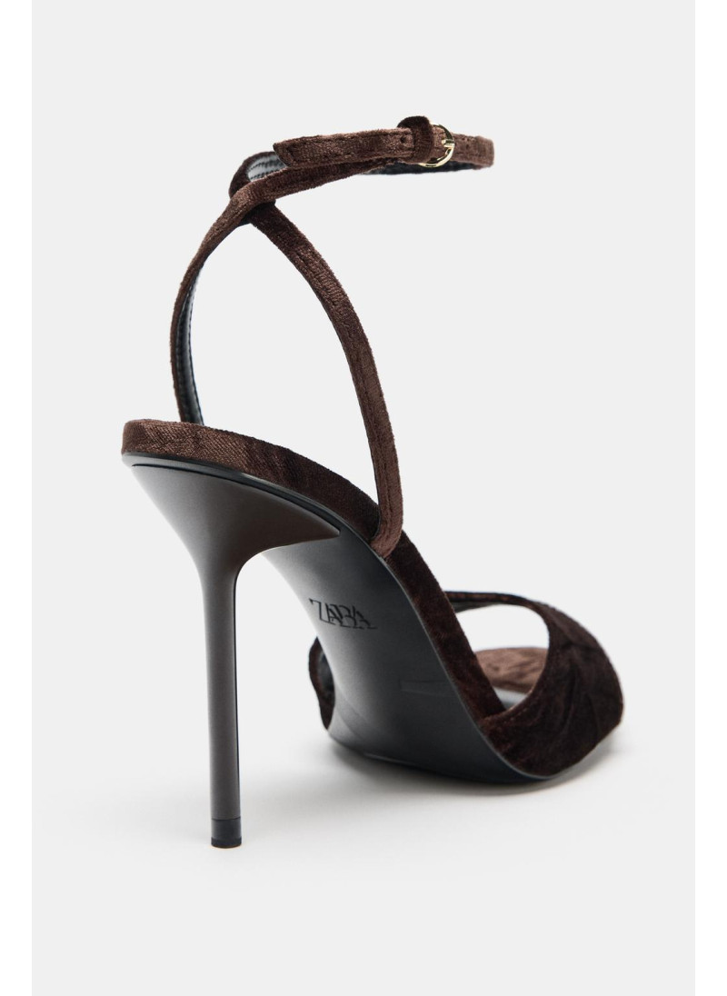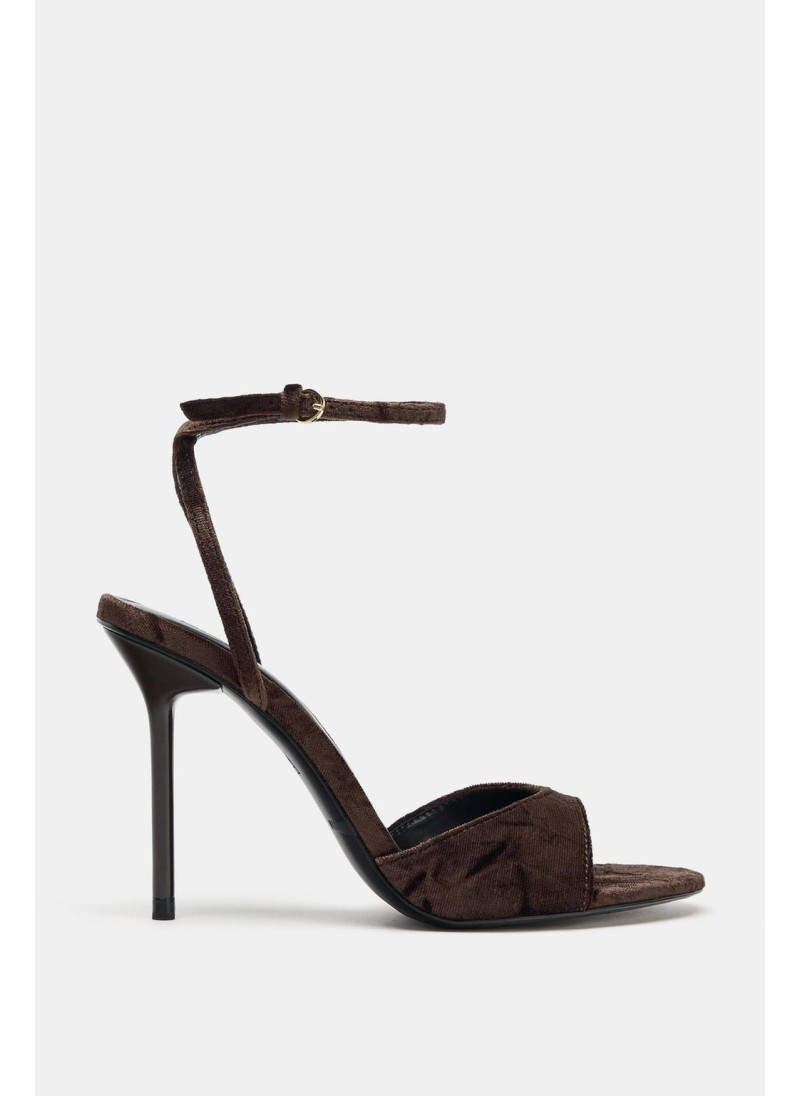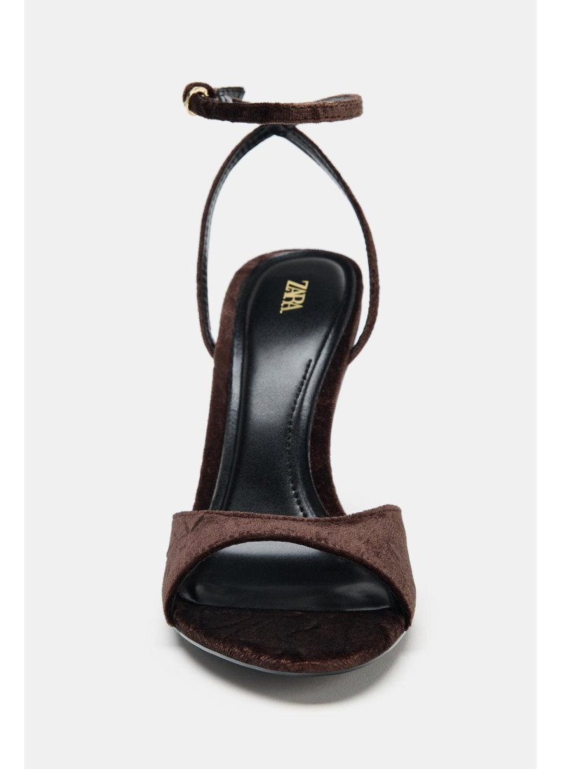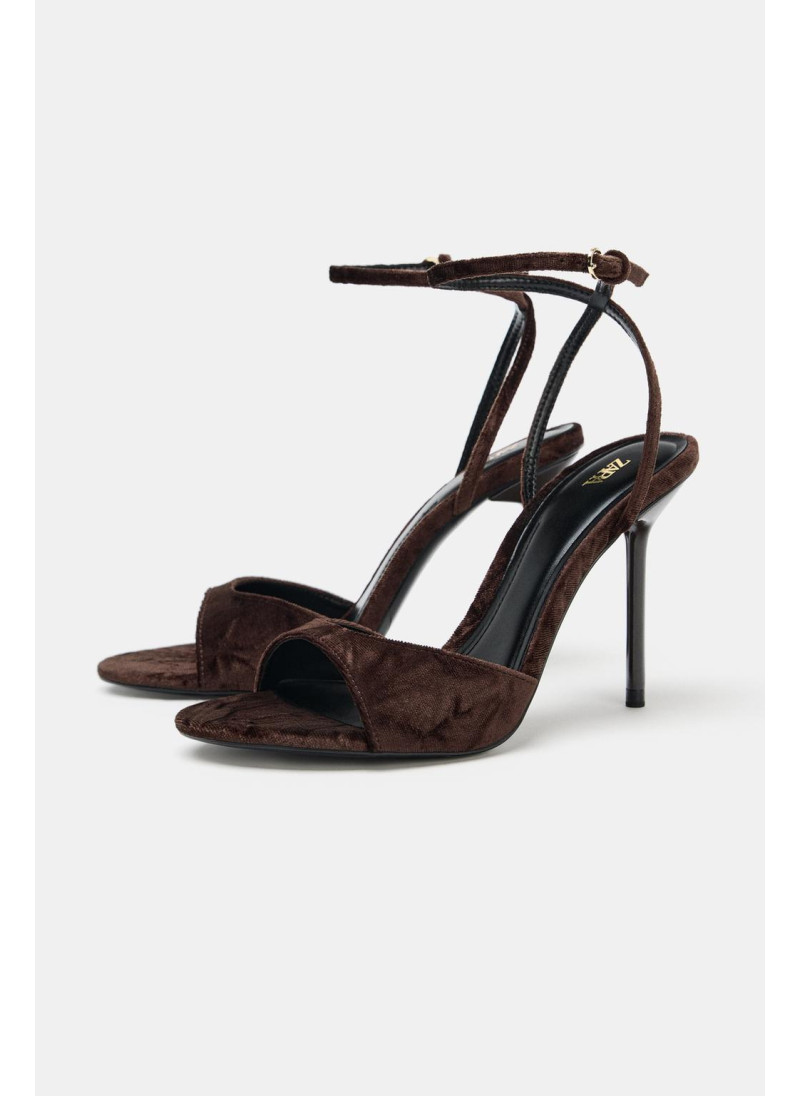 Босоножки на тонком высоком каблуке. Бархатистый ремешок спереди. Ремешок с пряжкой на щиколотке. Закругленный носок.