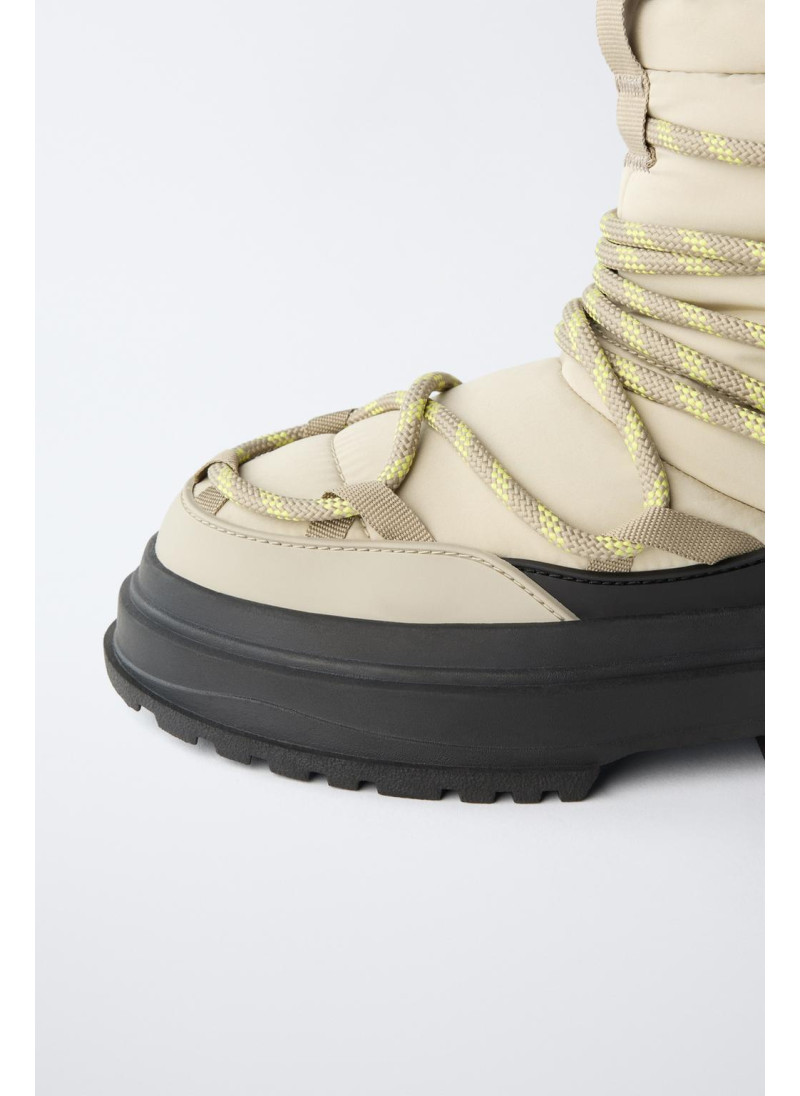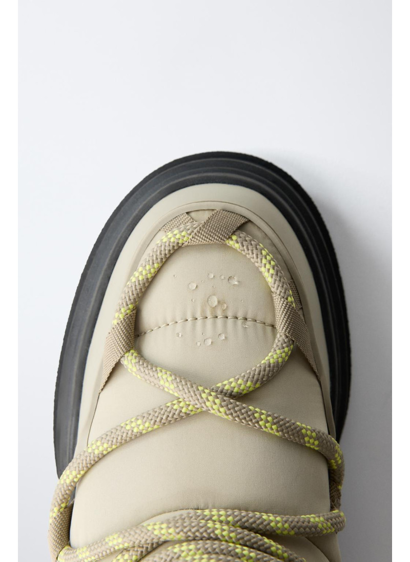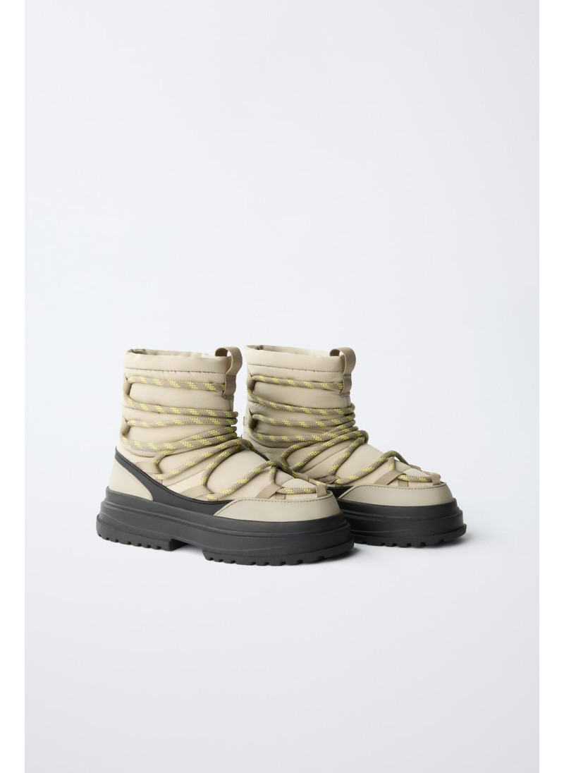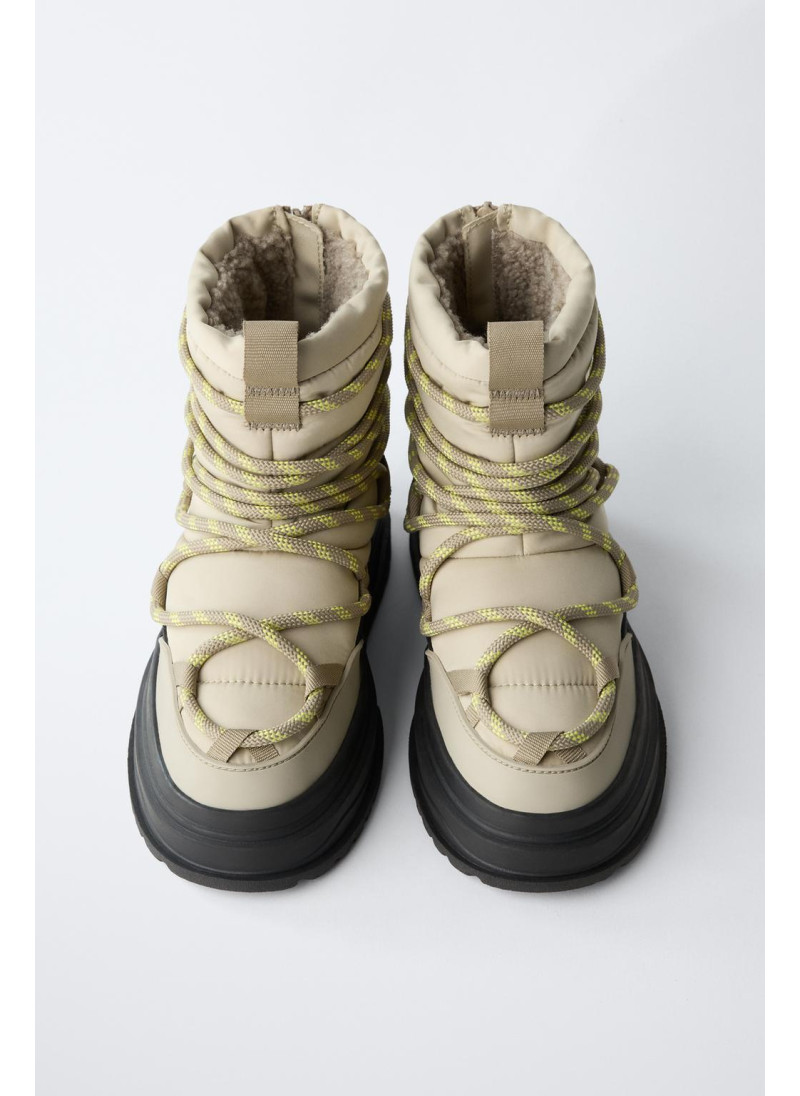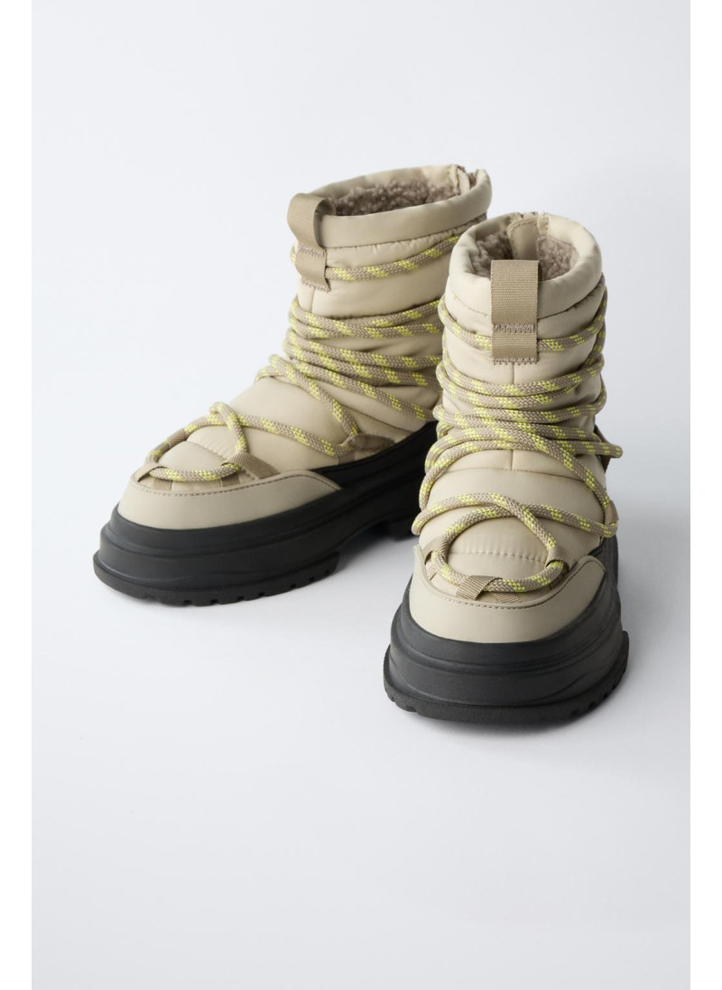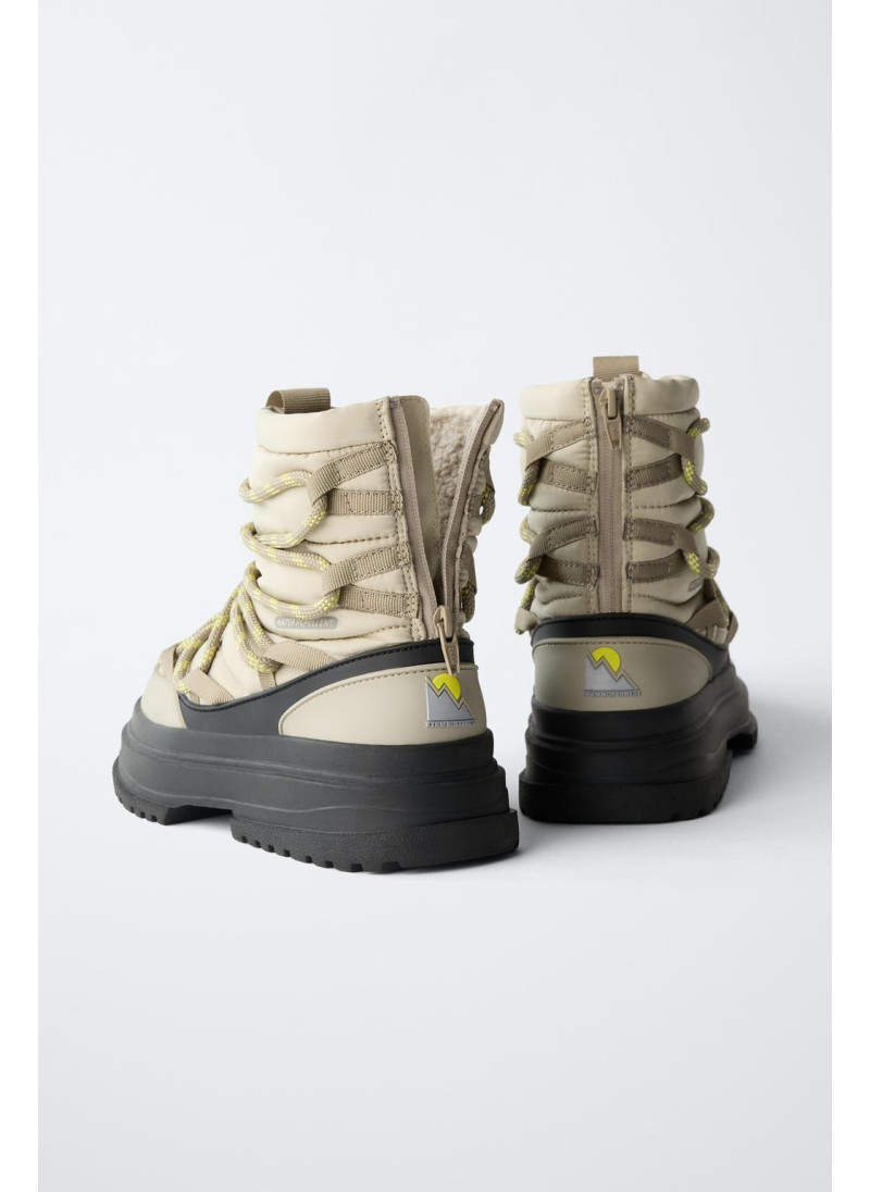 Утепленные зимние ботинки с защитой от влаги с деталями на шнуровке. Задняя молния для удобства надевания. Петля на задней части для легкости надевания. Гибкая стелька. Резиновая подошва.