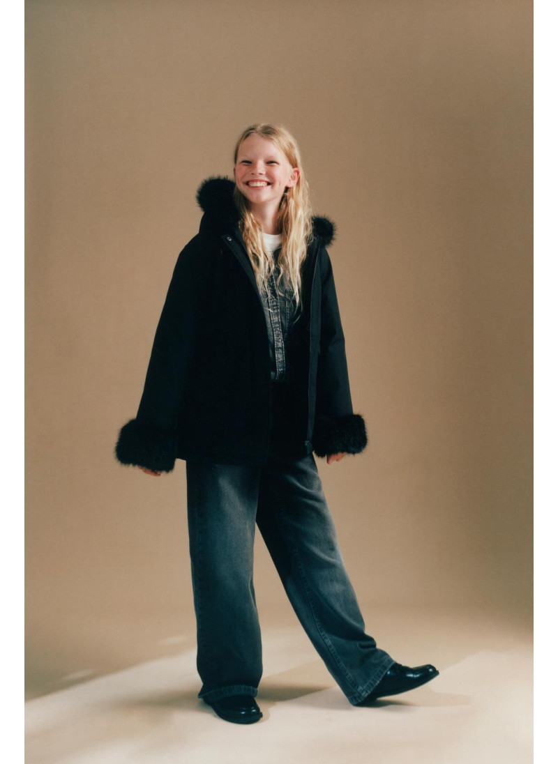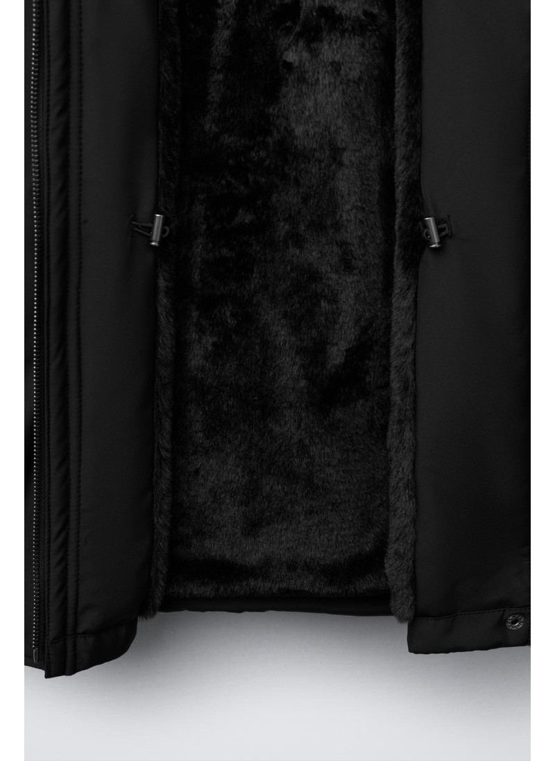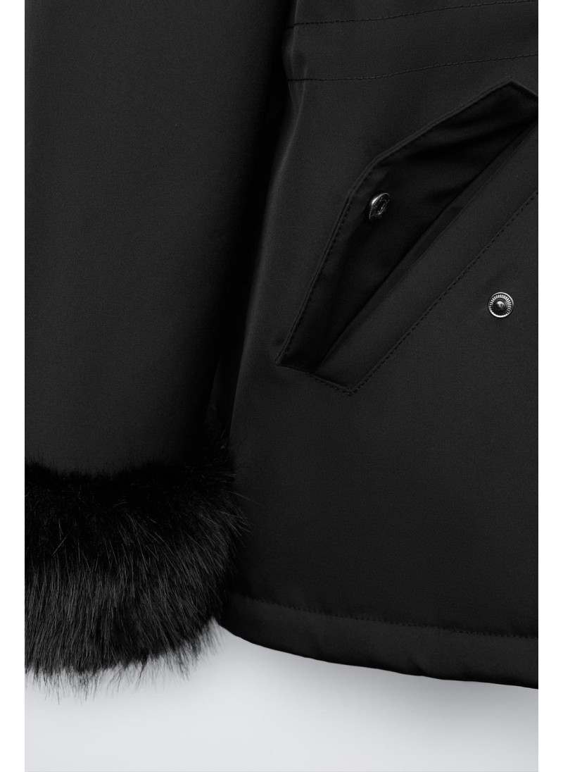 Парка с капюшоном и длинными рукавами. Отделка из искусственного меха. Застежка-молния под планкой с кнопками. Передние карманы с клапанами и кнопками. Эластичная резинка на талии. Внутренняя подкладка из искусственного меха.