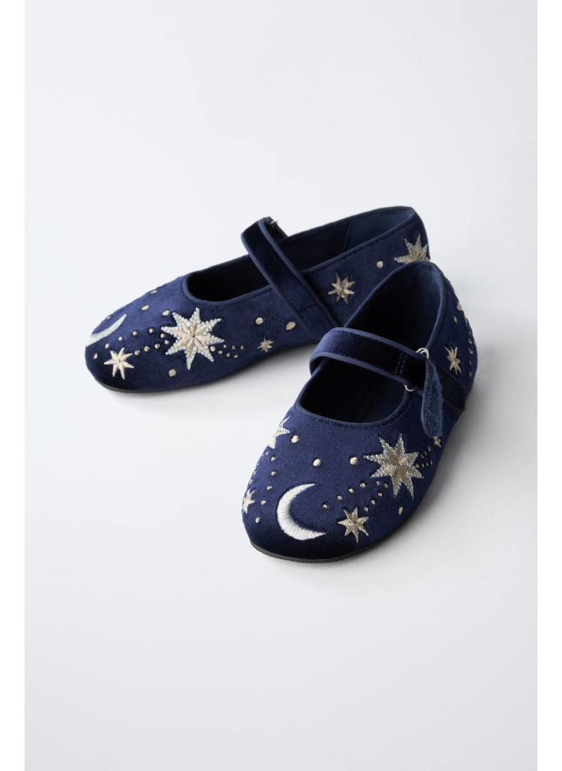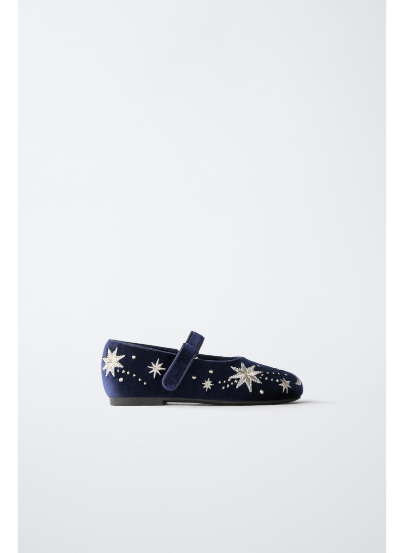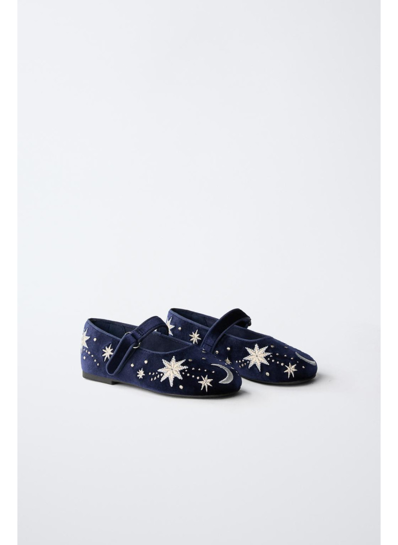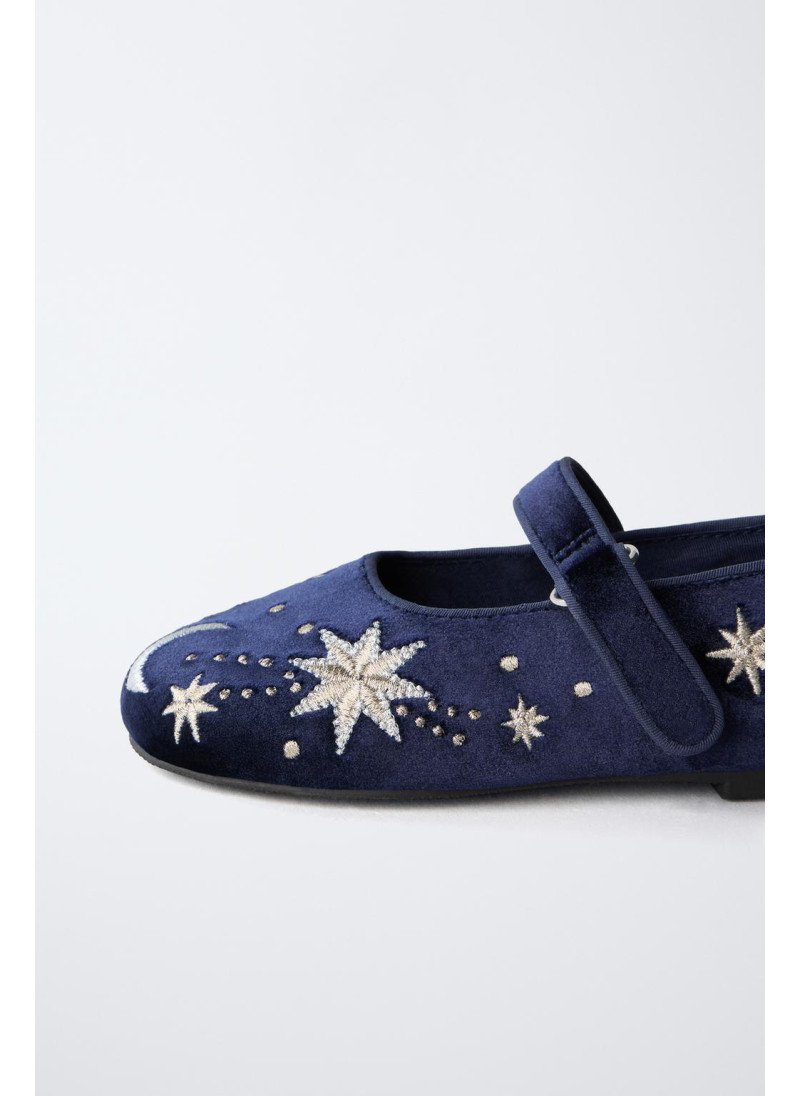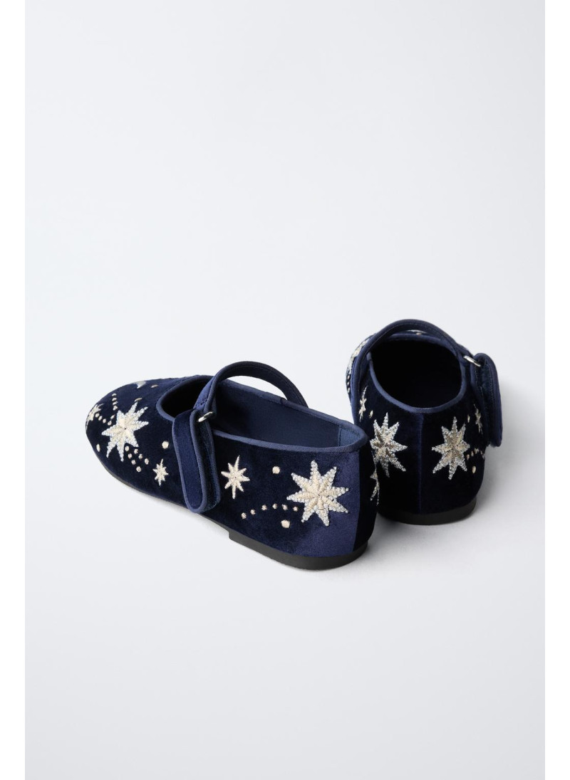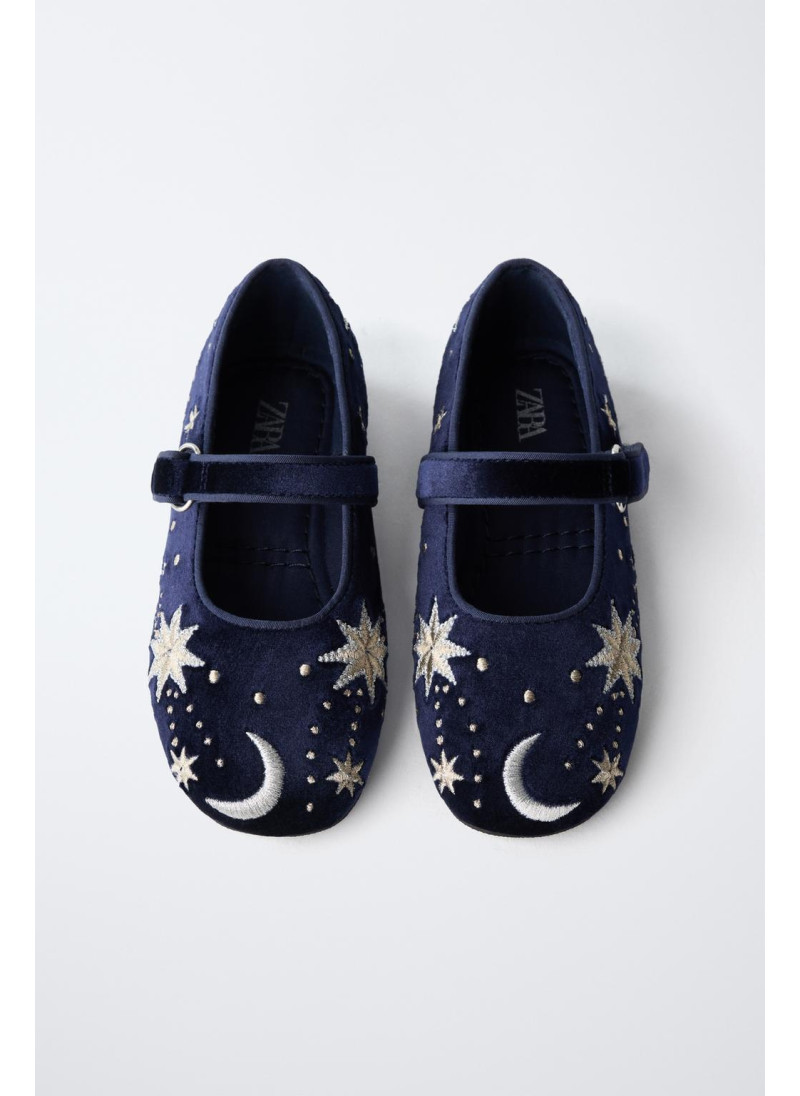Балетки с вышивкой и бархатной отделкой. Ремешок с текстильной застежкой сбоку. Гибкая стелька. Резиновая подошва.