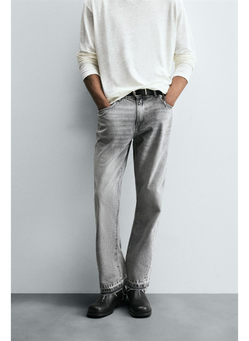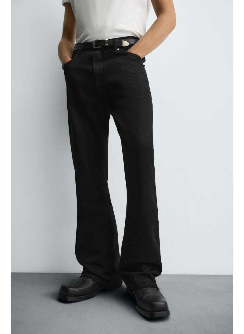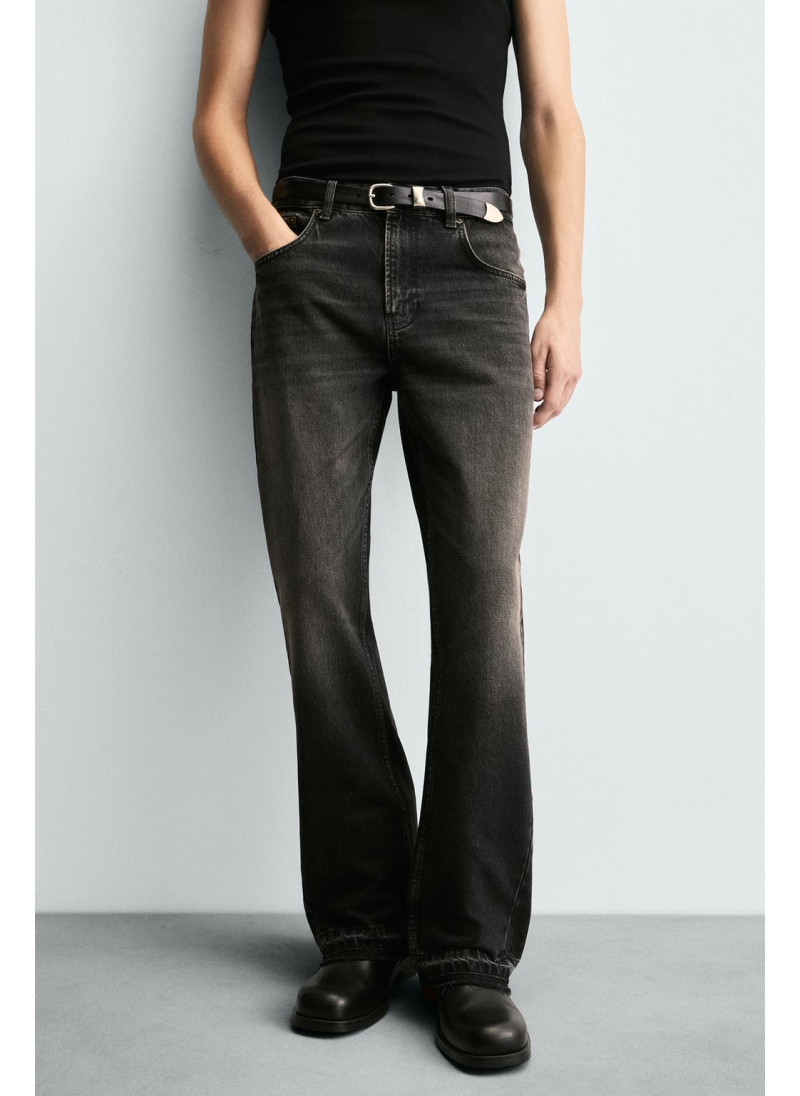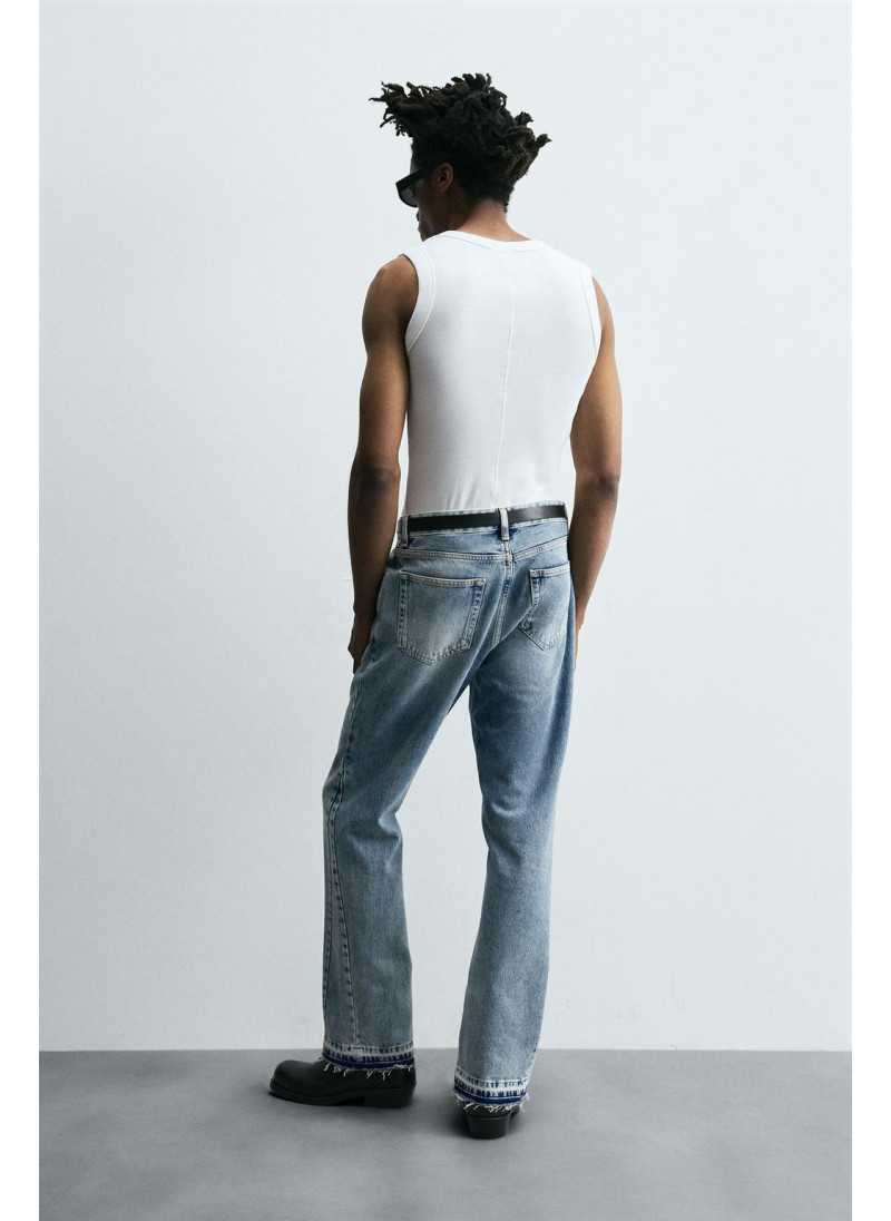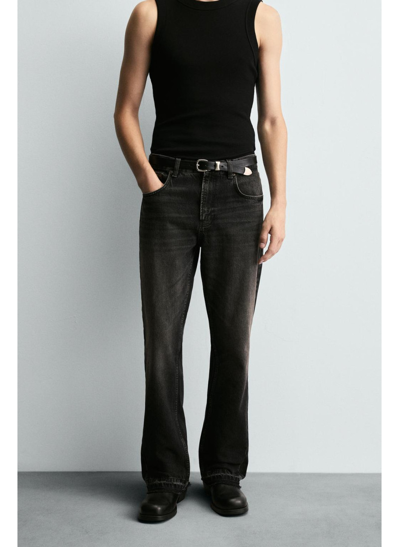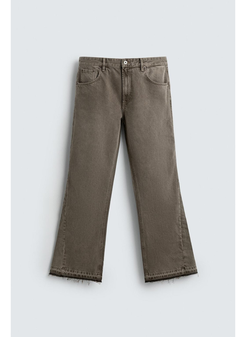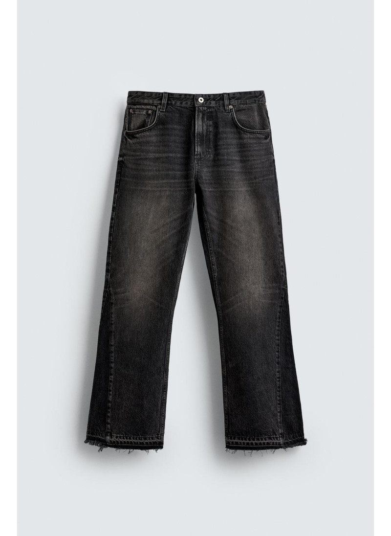 Облегающие сверху и расширяющиеся книзу с колена. Средняя посадка. Жесткая ткань. Джинсы с расклешенными брючинами из хлопкового денима. Пять карманов. Неровный нижний край. Молния и пуговицы на ластовице.