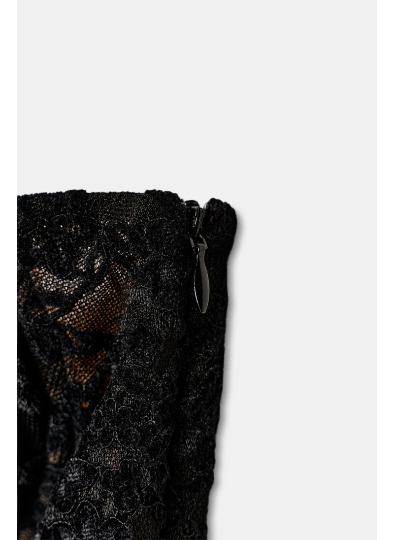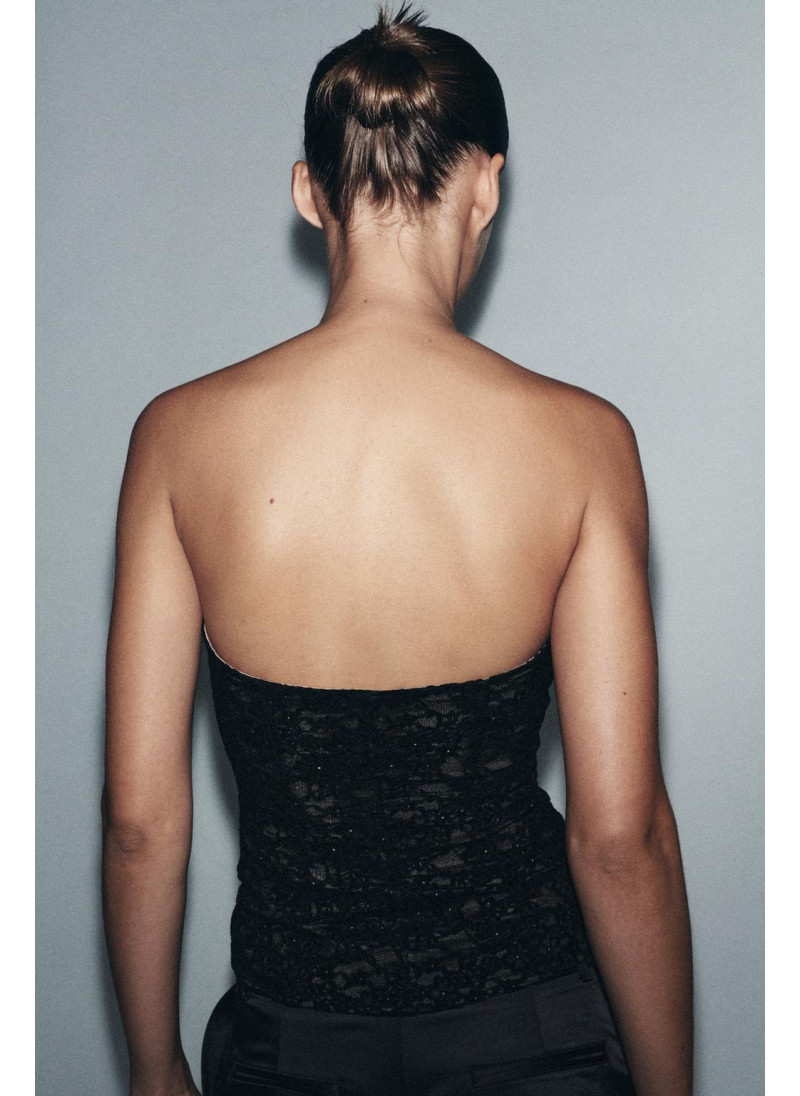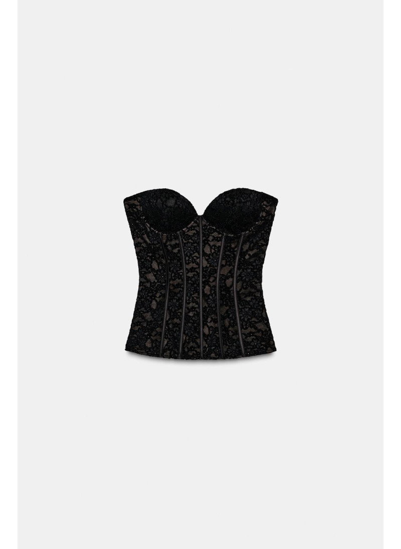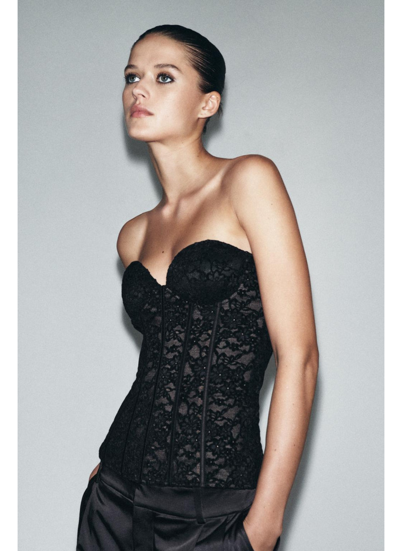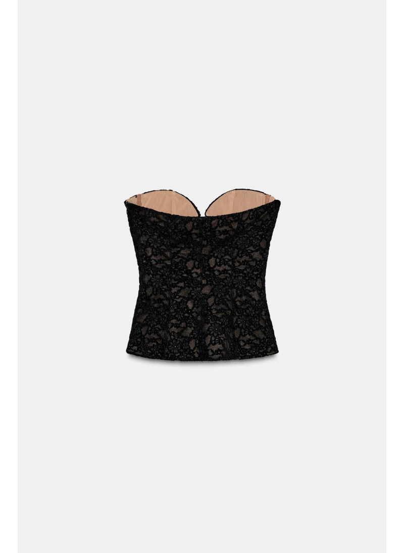 Корсет без бретелей на косточках с открытыми плечами. Детали из кружева и бархата. Потайная застежка-молния в шве.