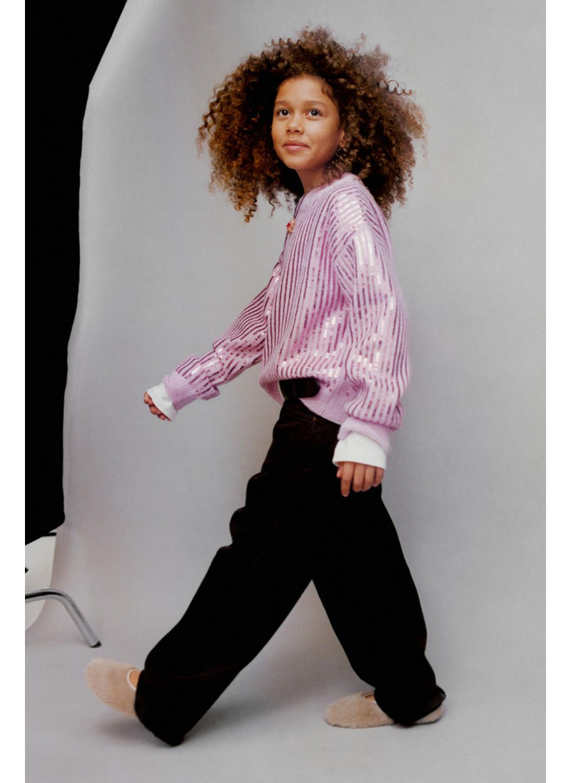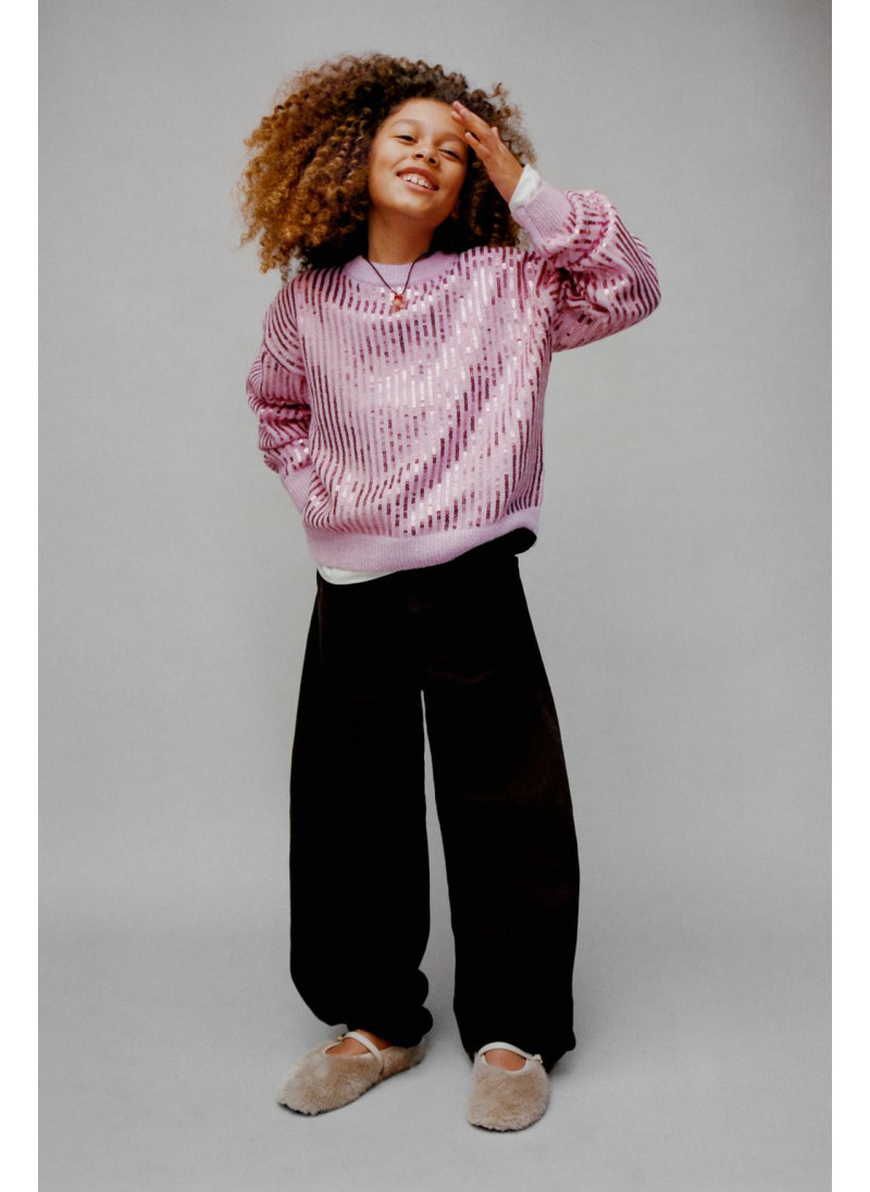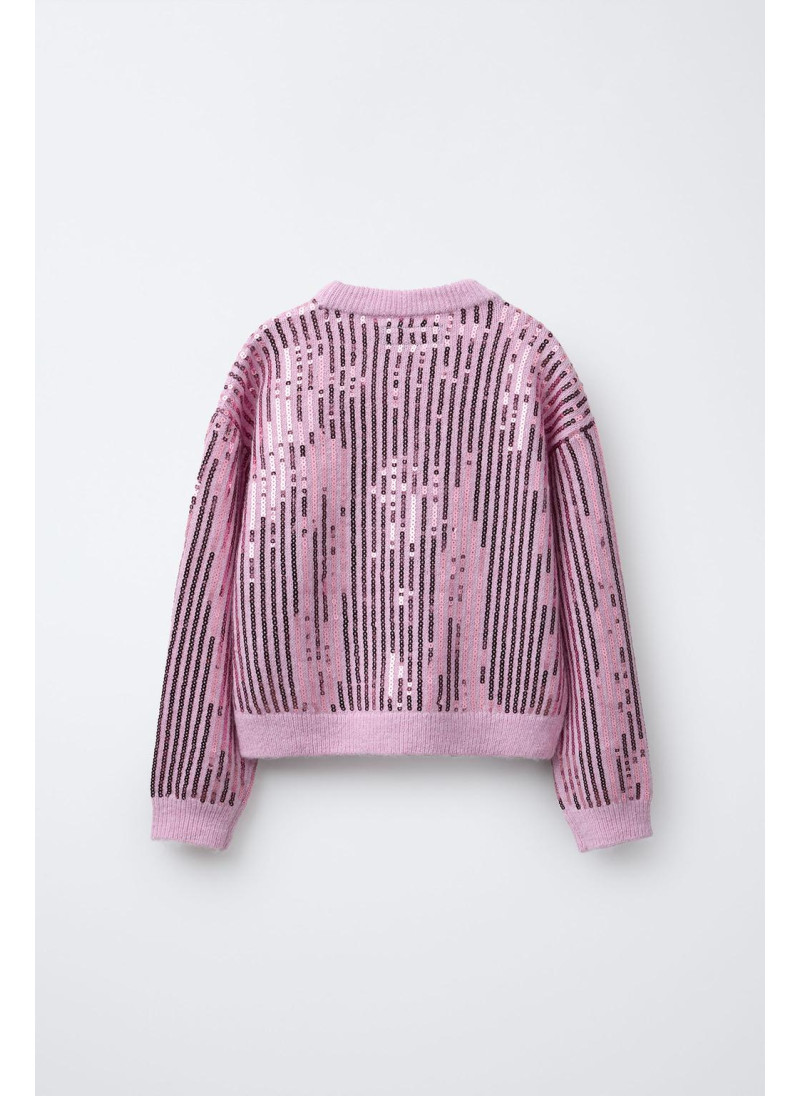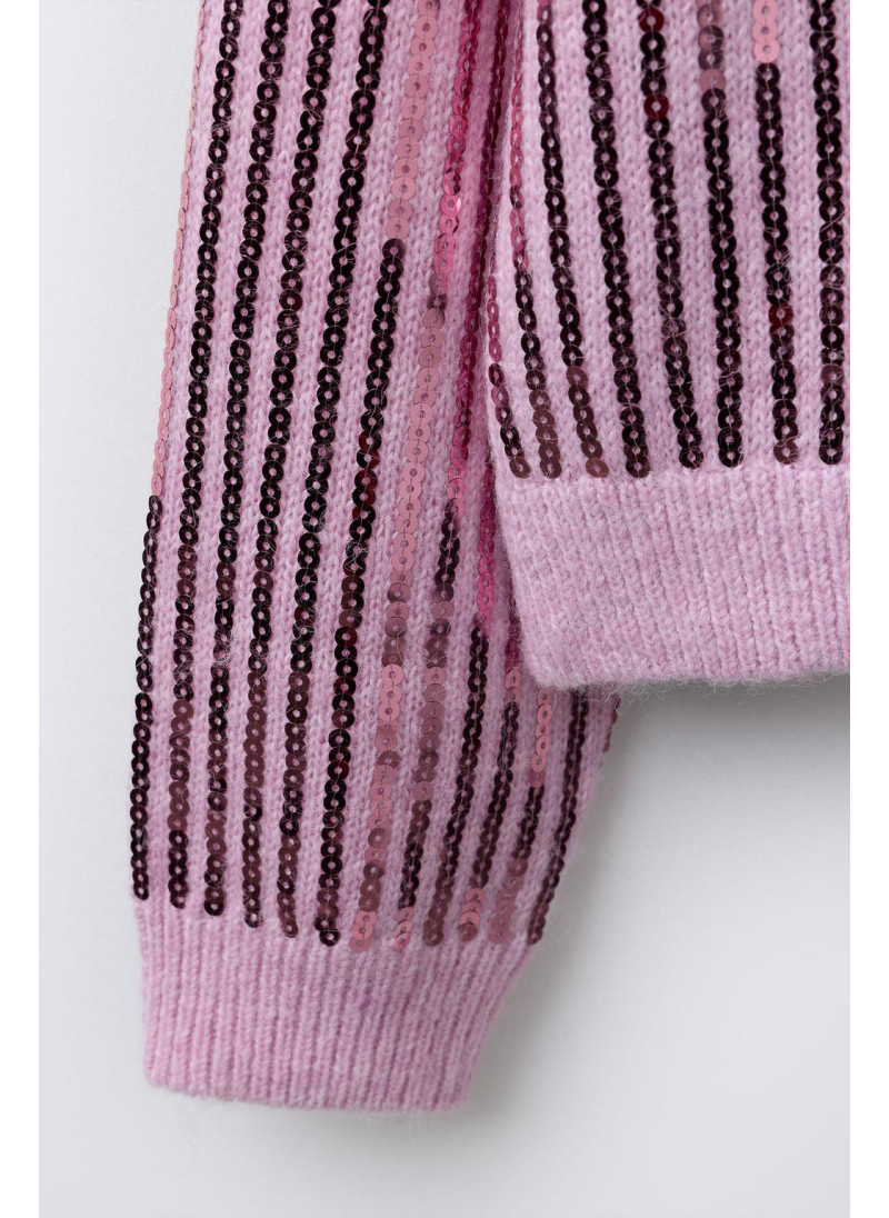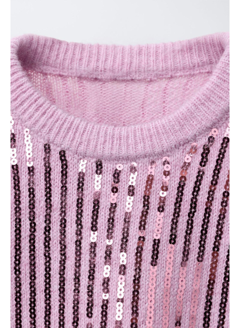 Вязаный джемпер с круглым вырезом и длинными рукавами. Декорирован пайетками в тон.
