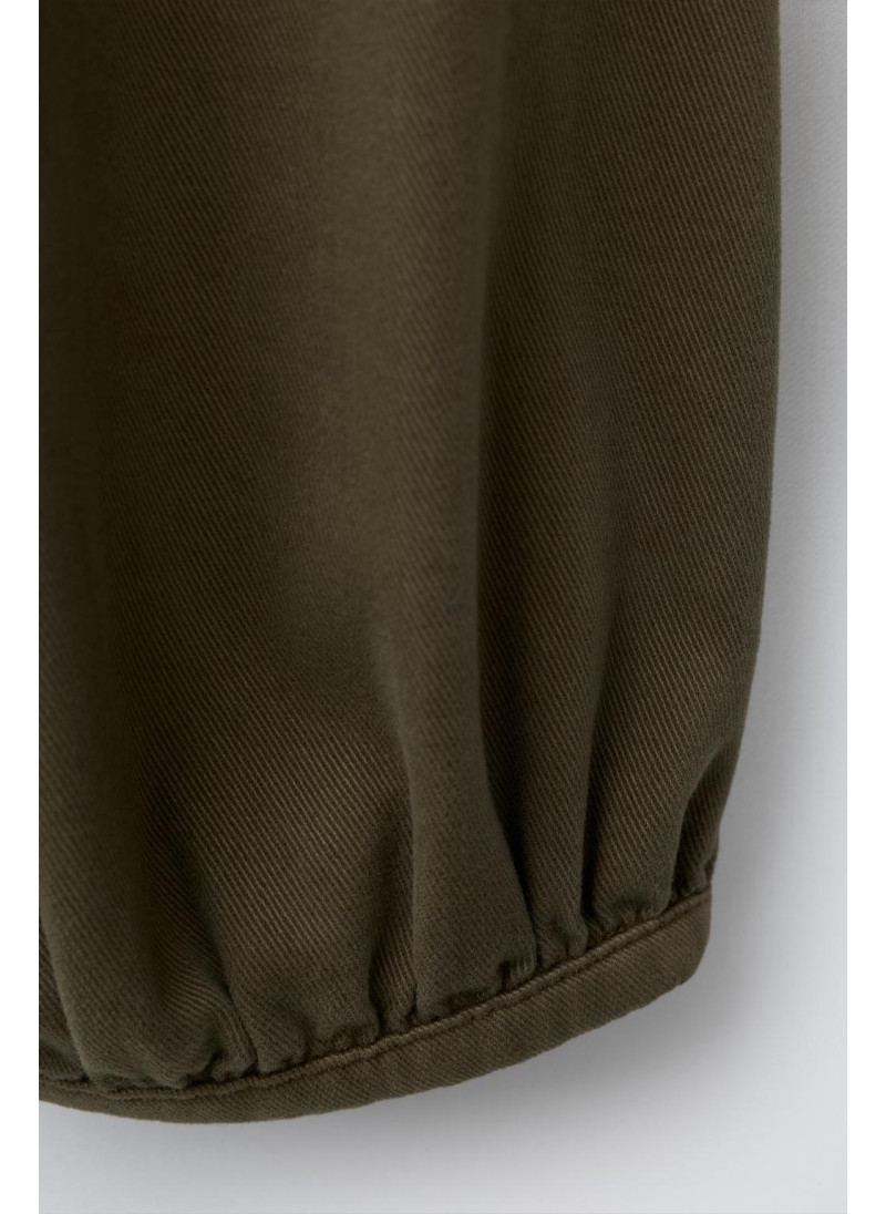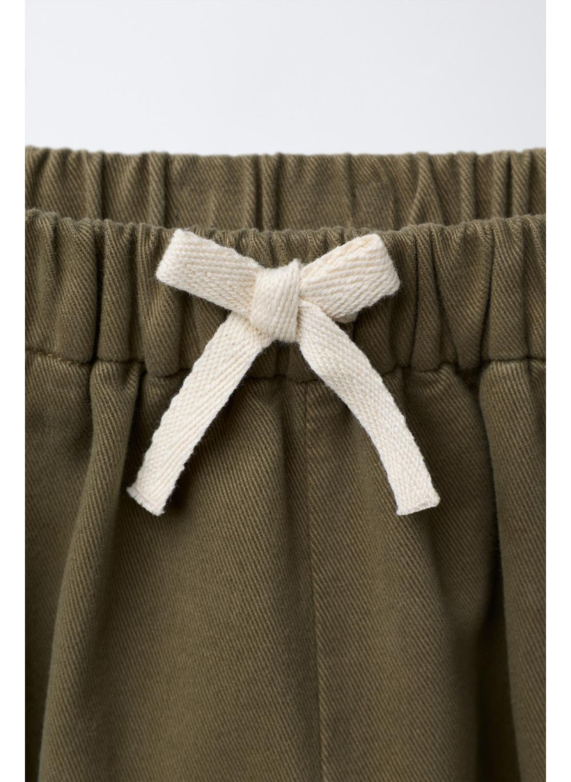 Брюки багги с эластичным поясом и бантом спереди. Передние карманы. Защипы спереди. Низ на манжете.